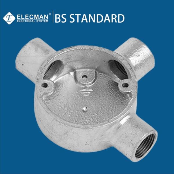 ELECMAN® BS4568 malleable iron tee outlet boxes three way type that are box structured with a circular shape. This type is "Tee Way",have at most three terminals protruding from it. The various sizes that the malleable circular boxes are available in are 20mm, 25mm, 32mm.